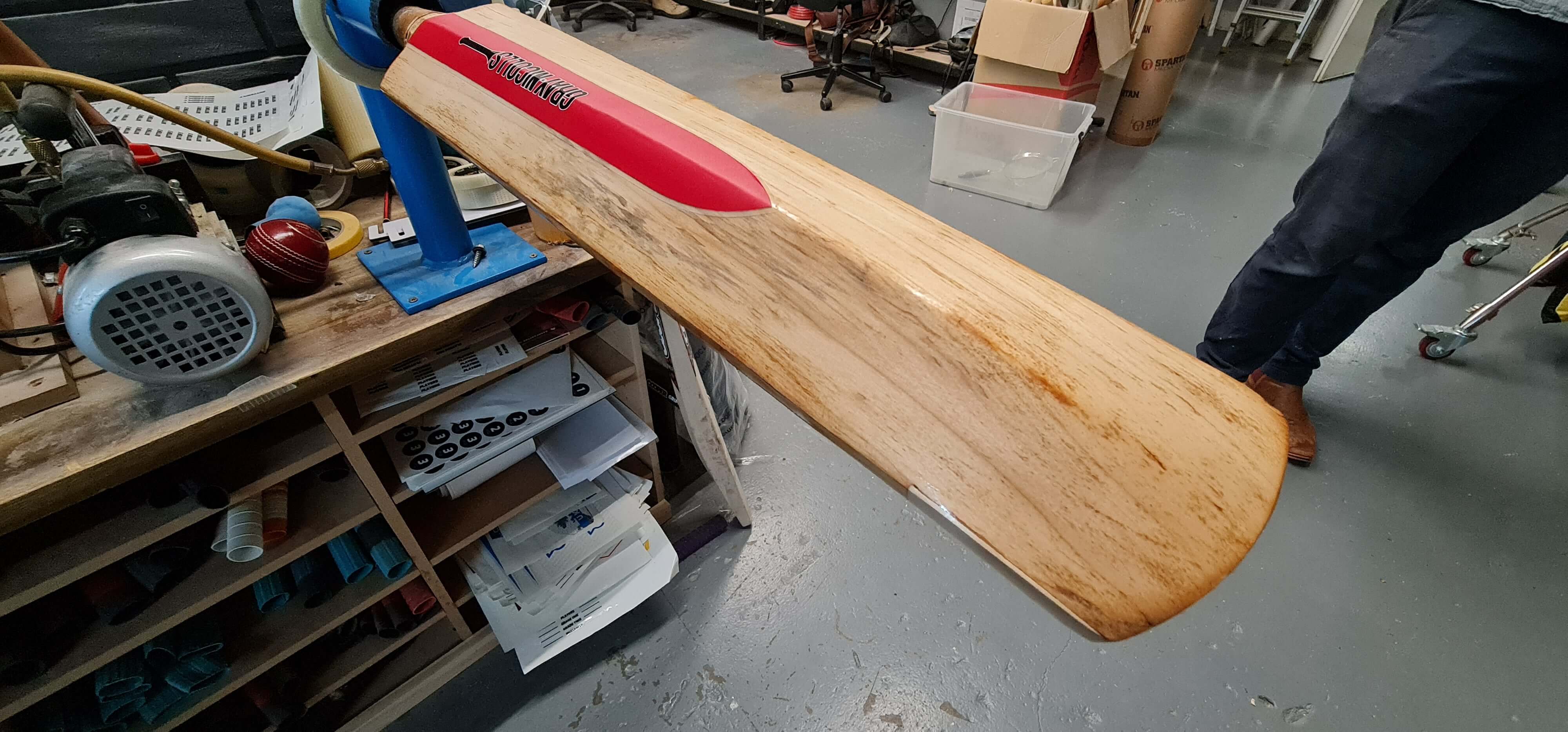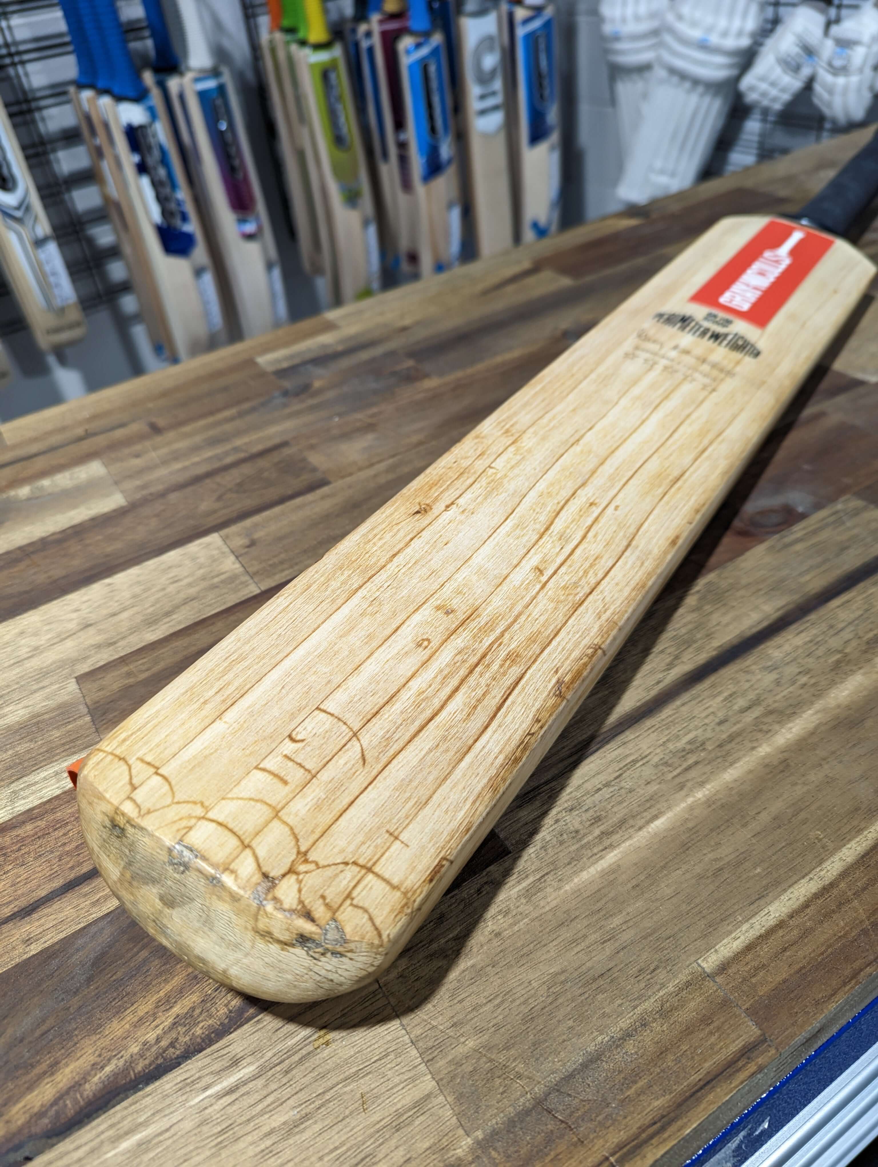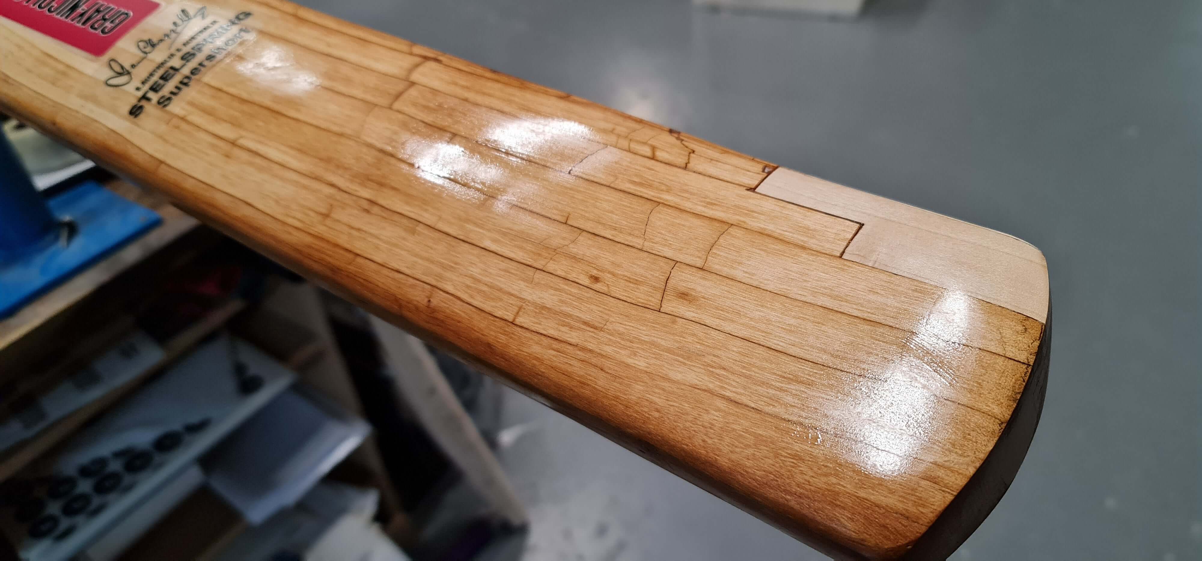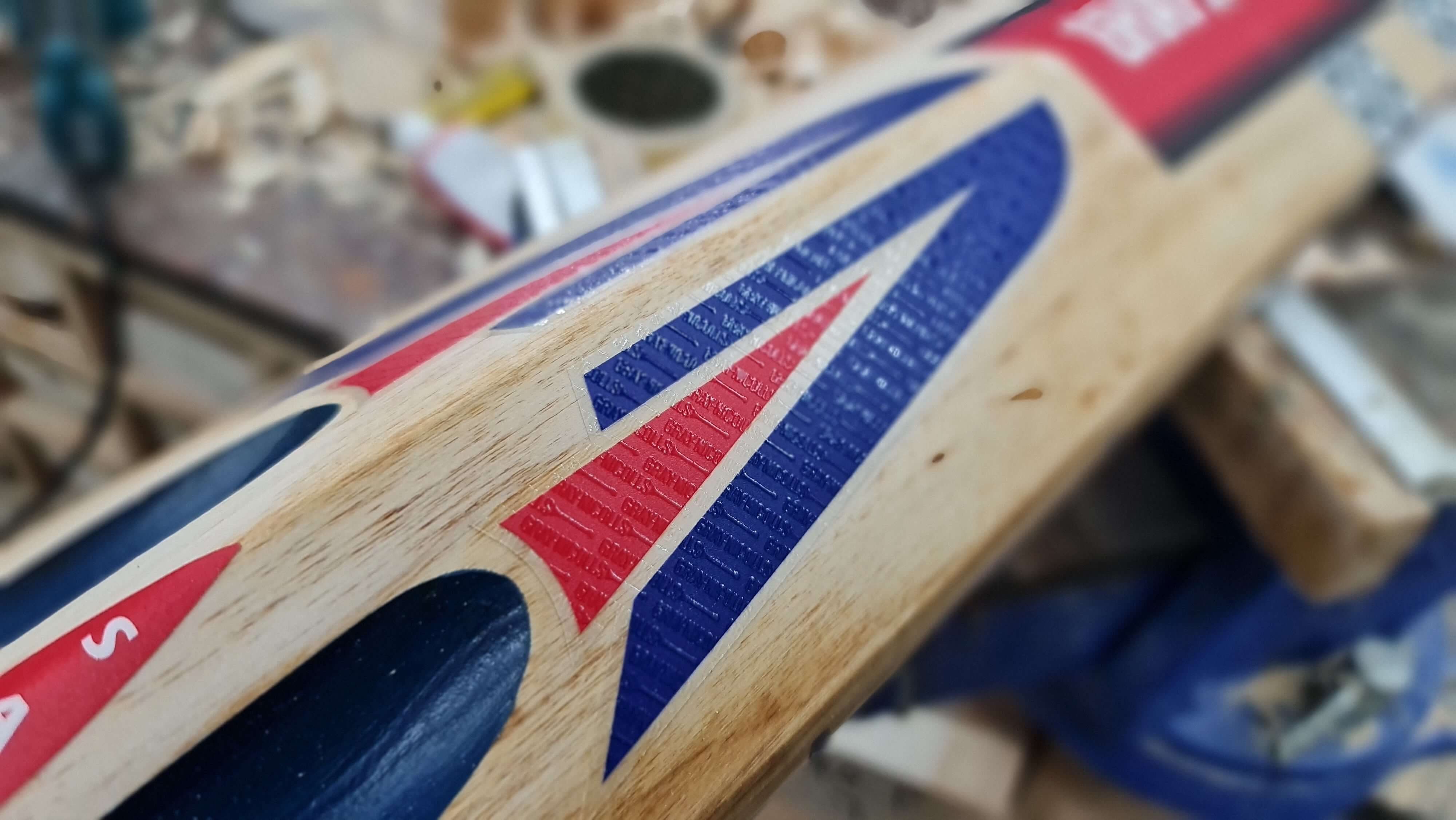 We sand down the entire cricket bat to expposure the beautiful light coloured English willow, fixing any damage we find along the way.