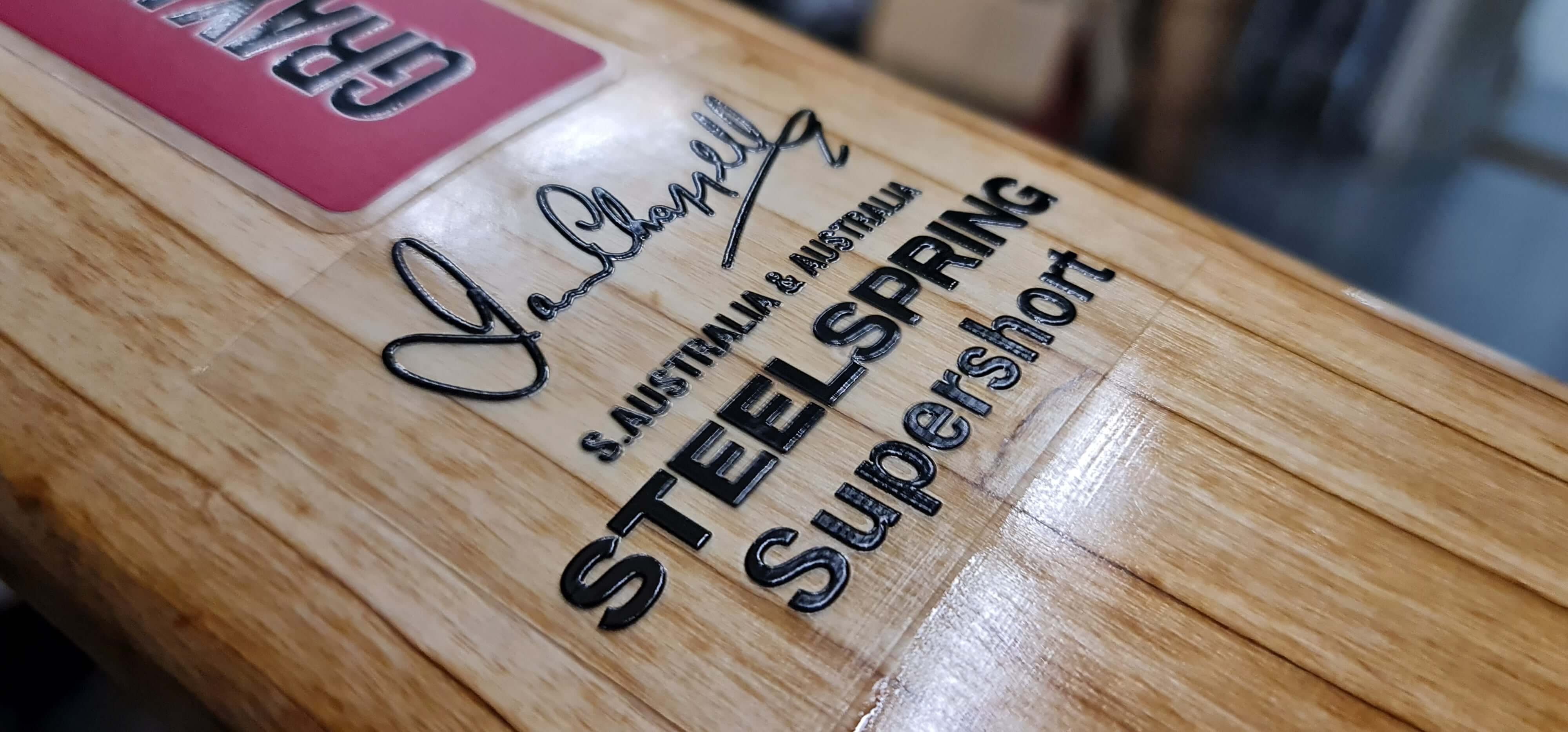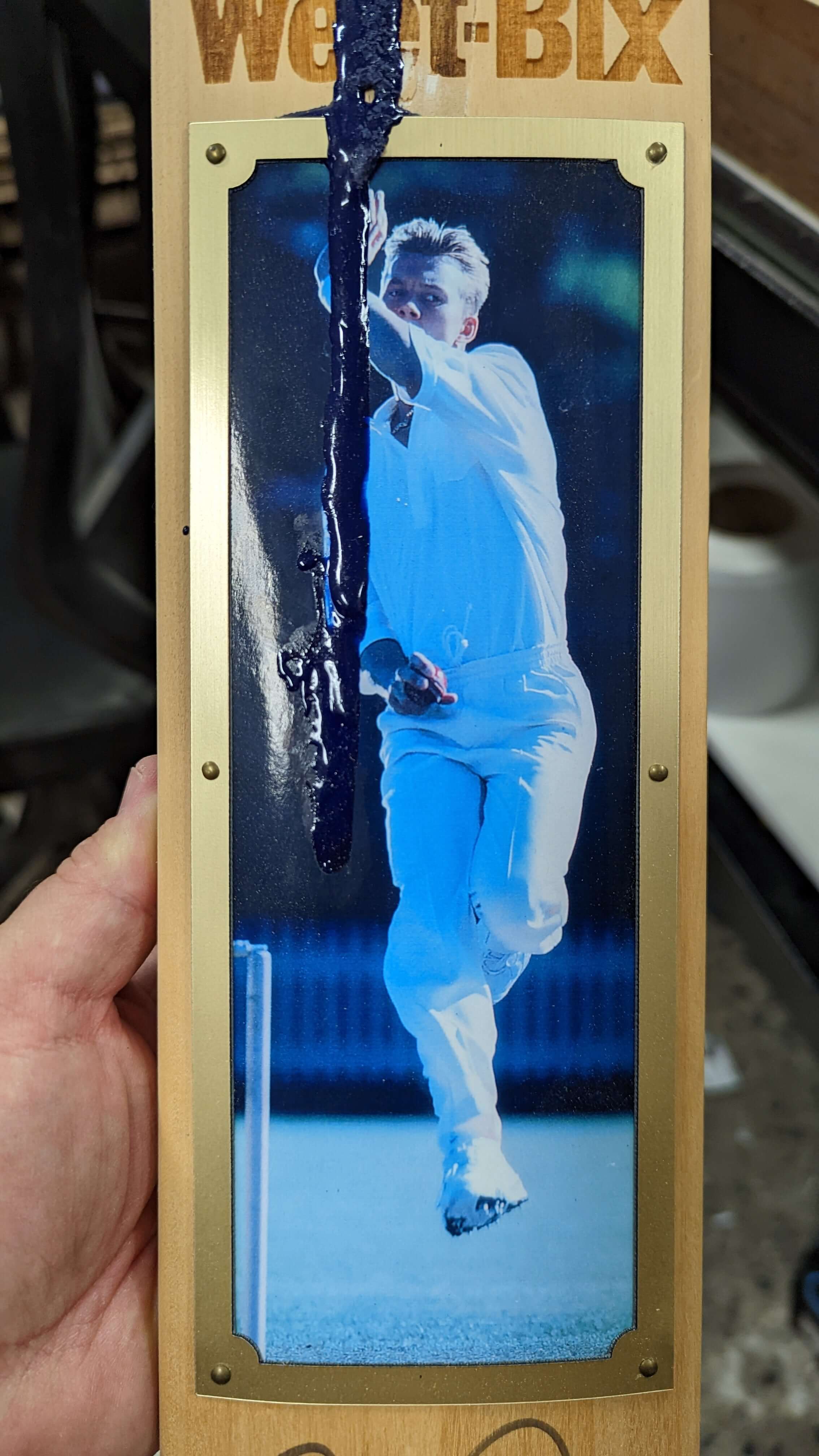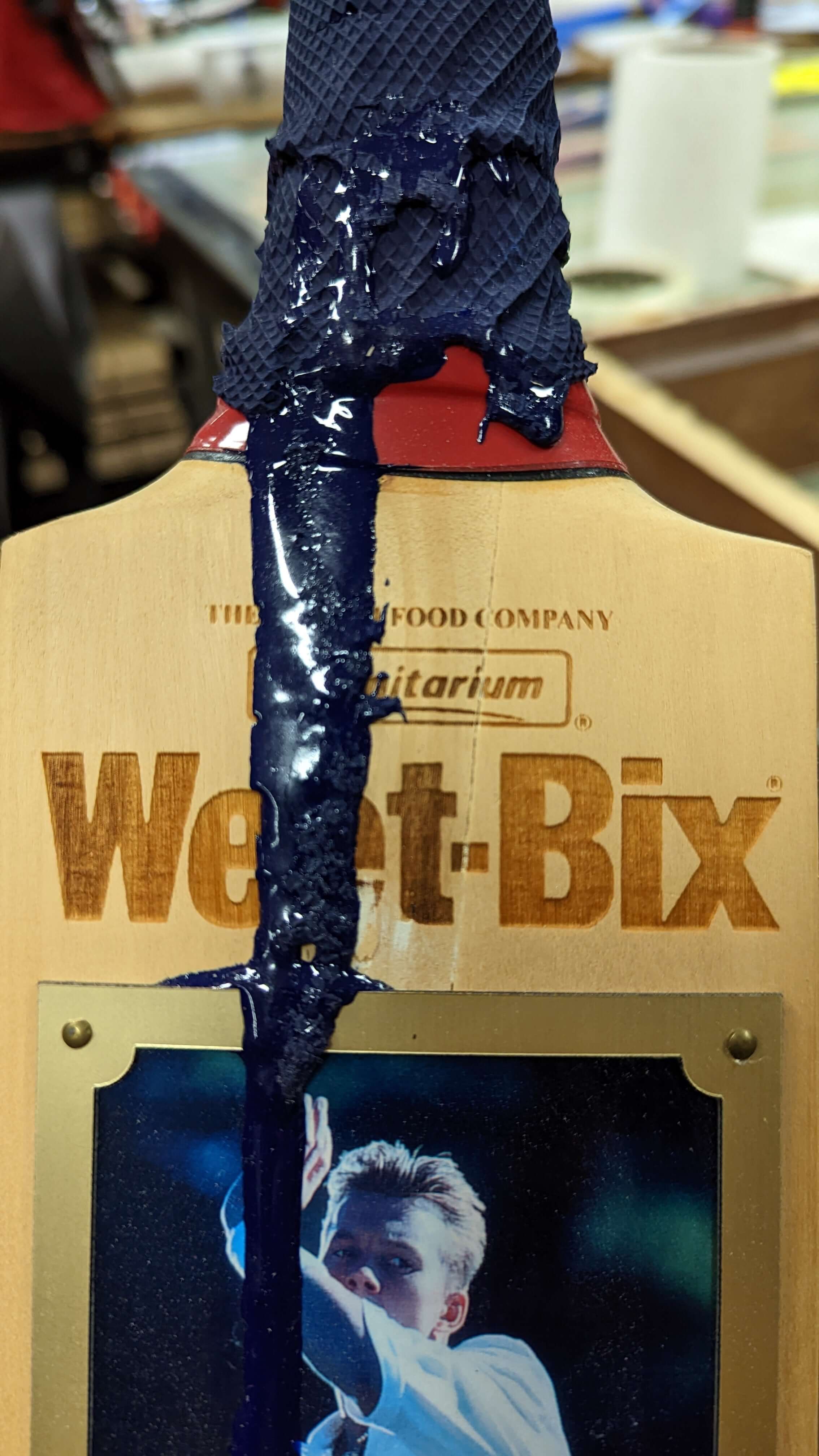 This Brett Lee Weet-Bix commemorative bat suffered severe grip melt damage, which extended through the laser engraving and onto the printed image. The restoration involved scanning and digitally modifying the original image, sanding away the damaged engraving, reprinting a new Brett Lee image, and re-laser engraving the Sanitarium and Weet-Bix branding. The bat has been fully restored for display.