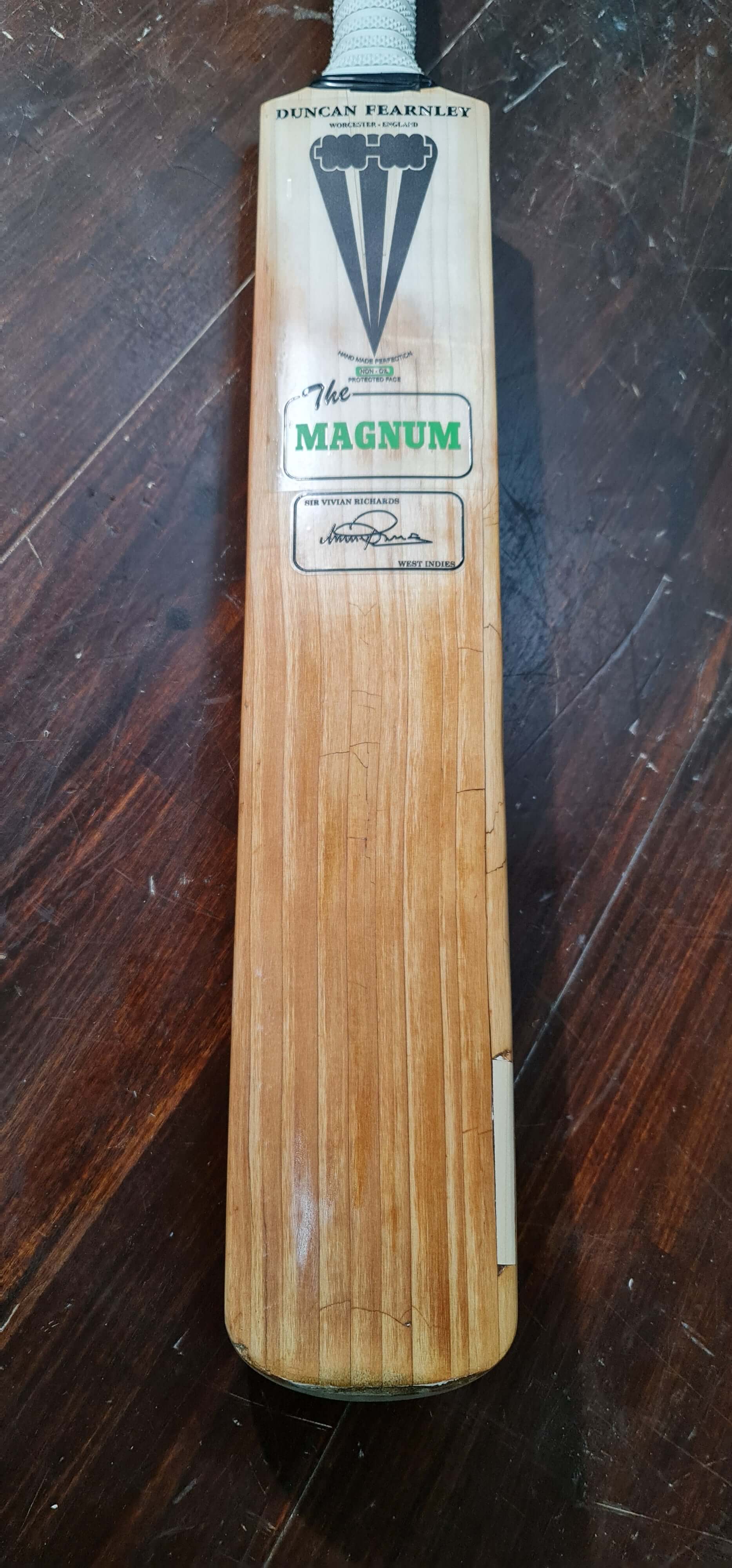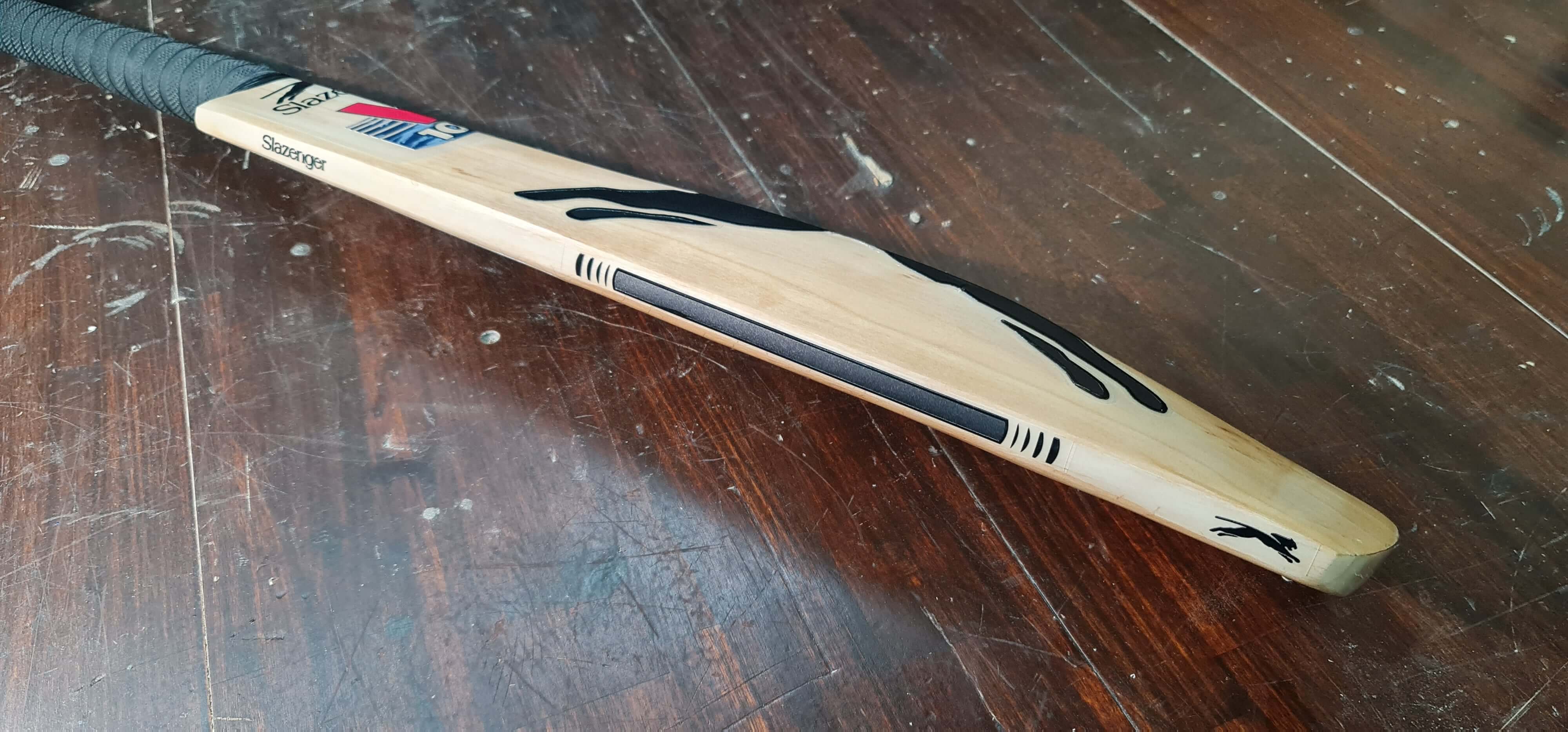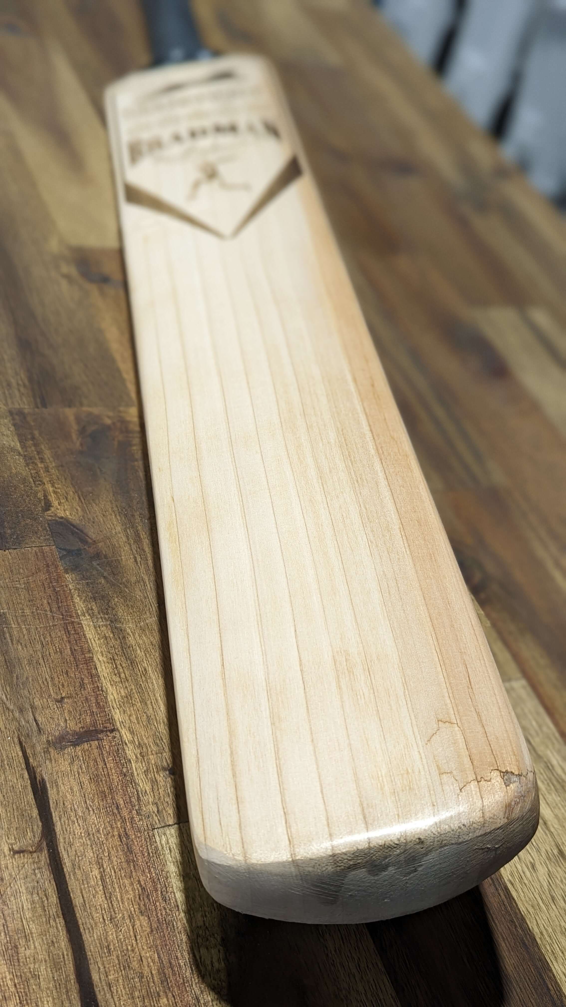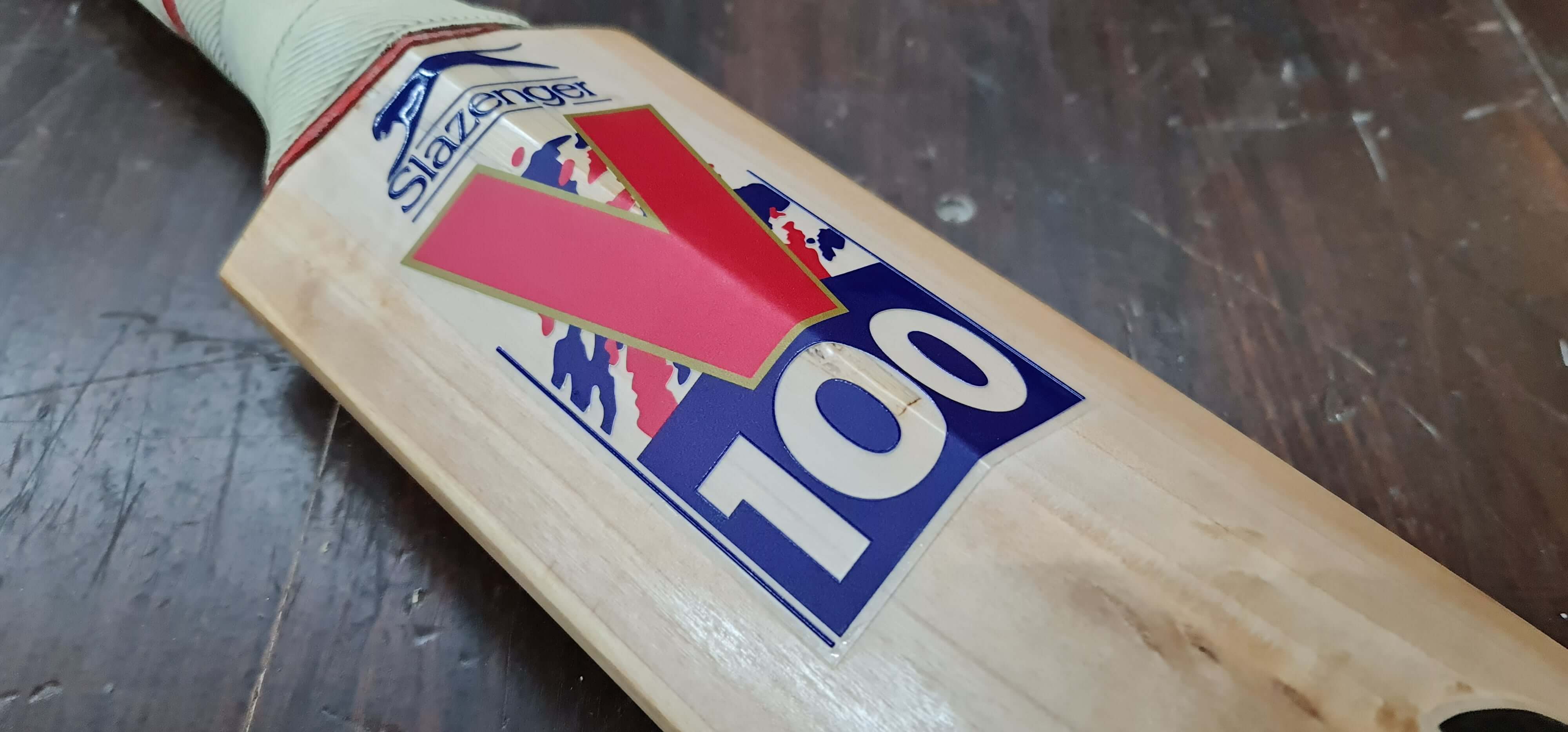 This Slazenger Bradman bat required extensive repairs due to severe handle damage and structural weakness. The restoration process included a full handle replacement, resurfacing, and precision laser engraving to restore the original branding. The bat has been fully rebuilt while maintaining its historical integrity.