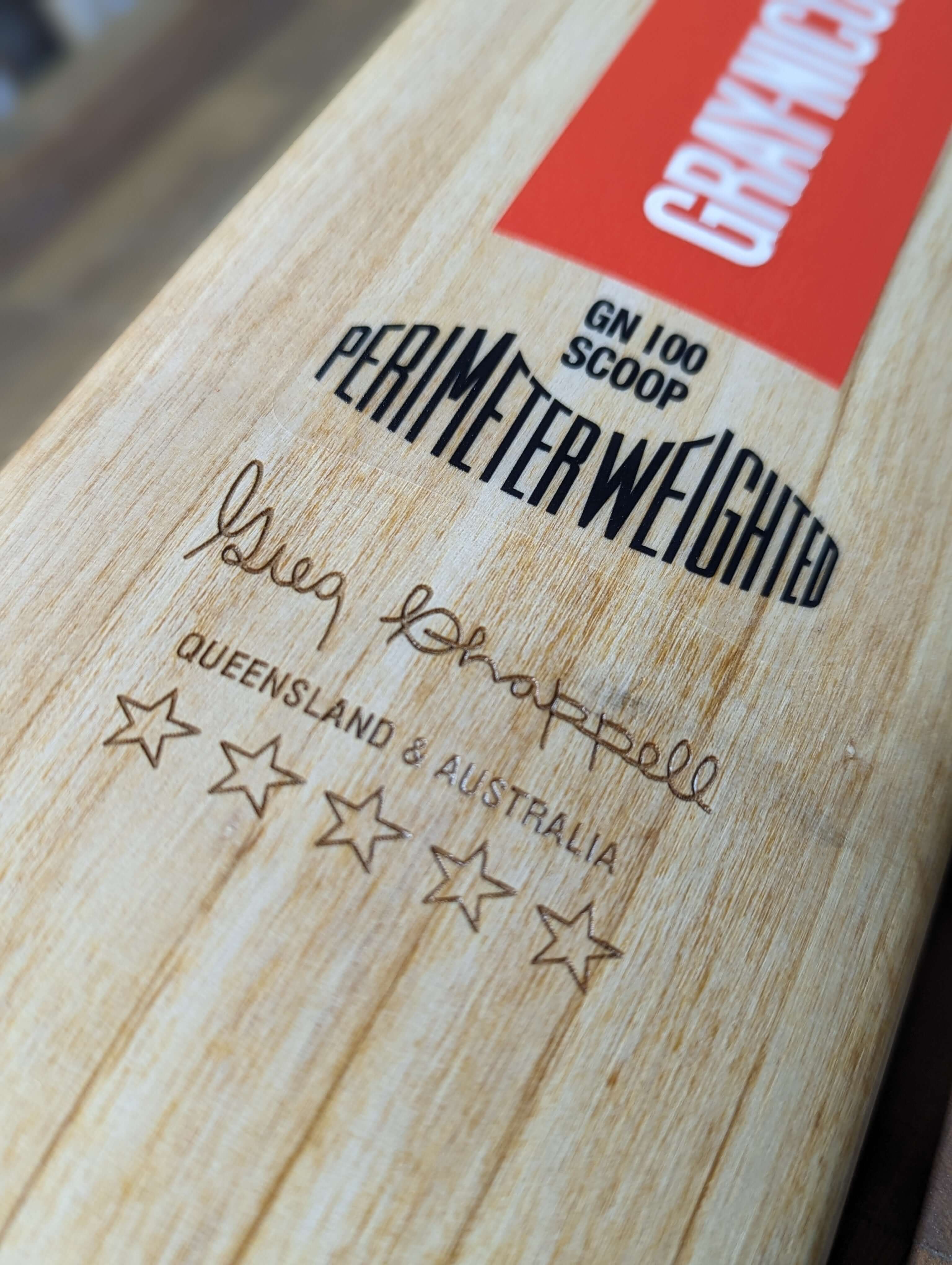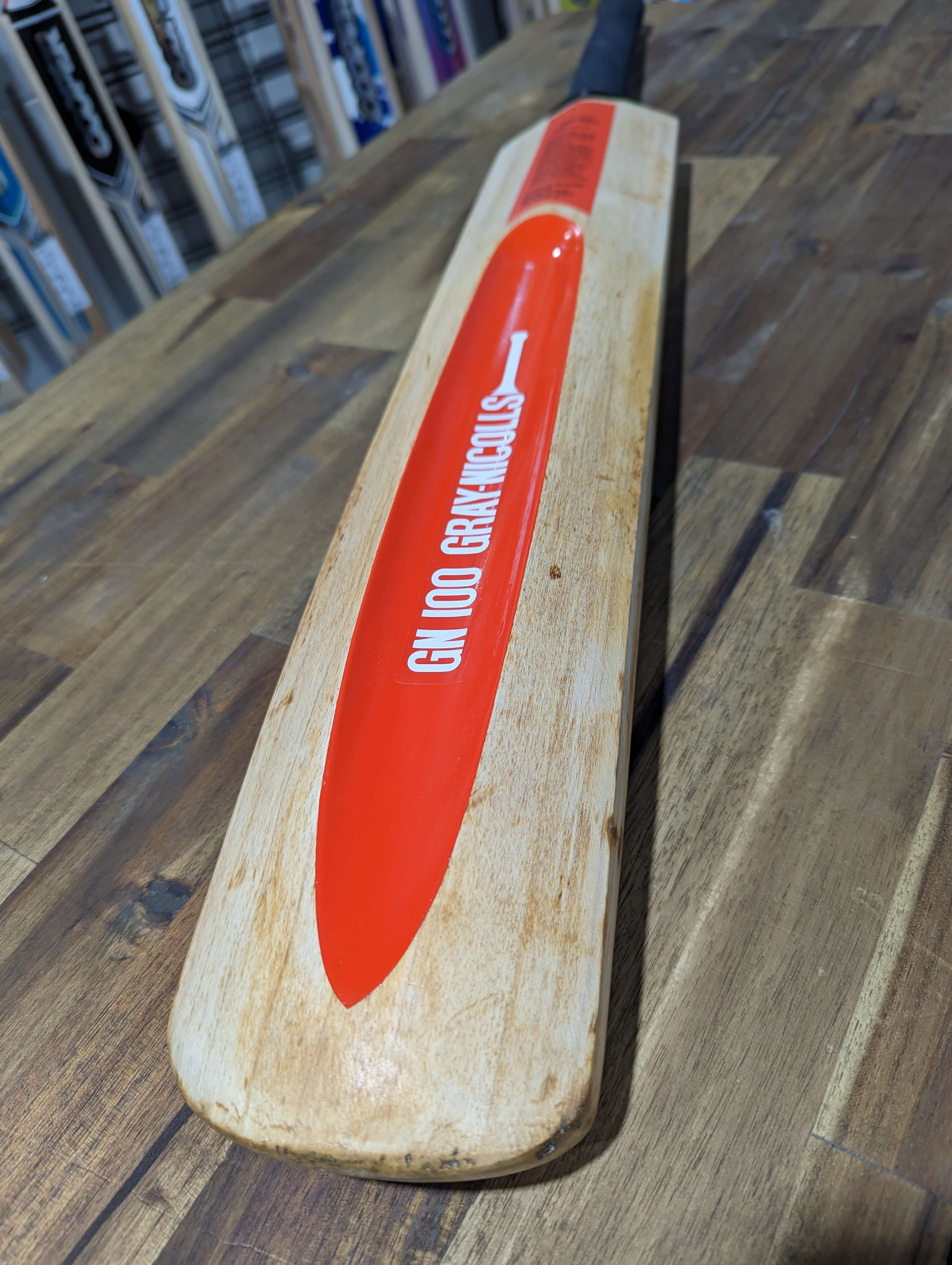 This Gray-Nicolls GN 100 Scoop underwent a full refurbishment, including resurfacing the blade and restoring the original branding. The signature scoop was carefully repainted to match its classic look, and new laser engraving was applied to enhance the original details. The bat has been fully refreshed while maintaining its iconic design.